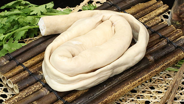 肠壁紧致有适量脂肪,有很强的韧性。烹饪后无腥味,口感劲道,鲜香肥美不腻口。