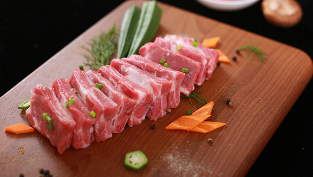 取自黑猪胸腔片状排骨,骨质密度高,色泽鲜红,细腻有弹性,肉香浓郁,柔嫩多汁。