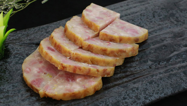选用天然肠衣,包裹黑猪后腿肉,配以松仁辅料,口感滑中有脆,浓郁的风味感。
