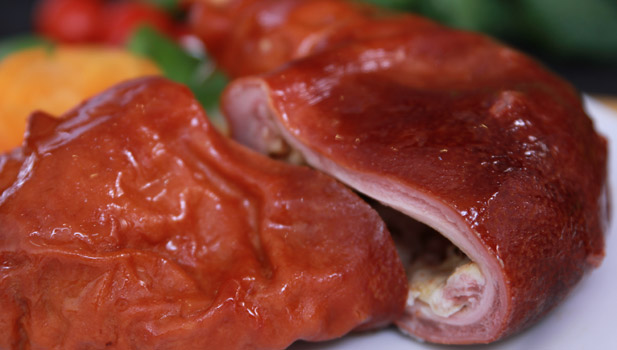 肉汤灌制,鲜葱、鲜姜调味,鲜嫩美味。果木熏烤,外焦酥脆、色泽光亮,掰着吃更美味。