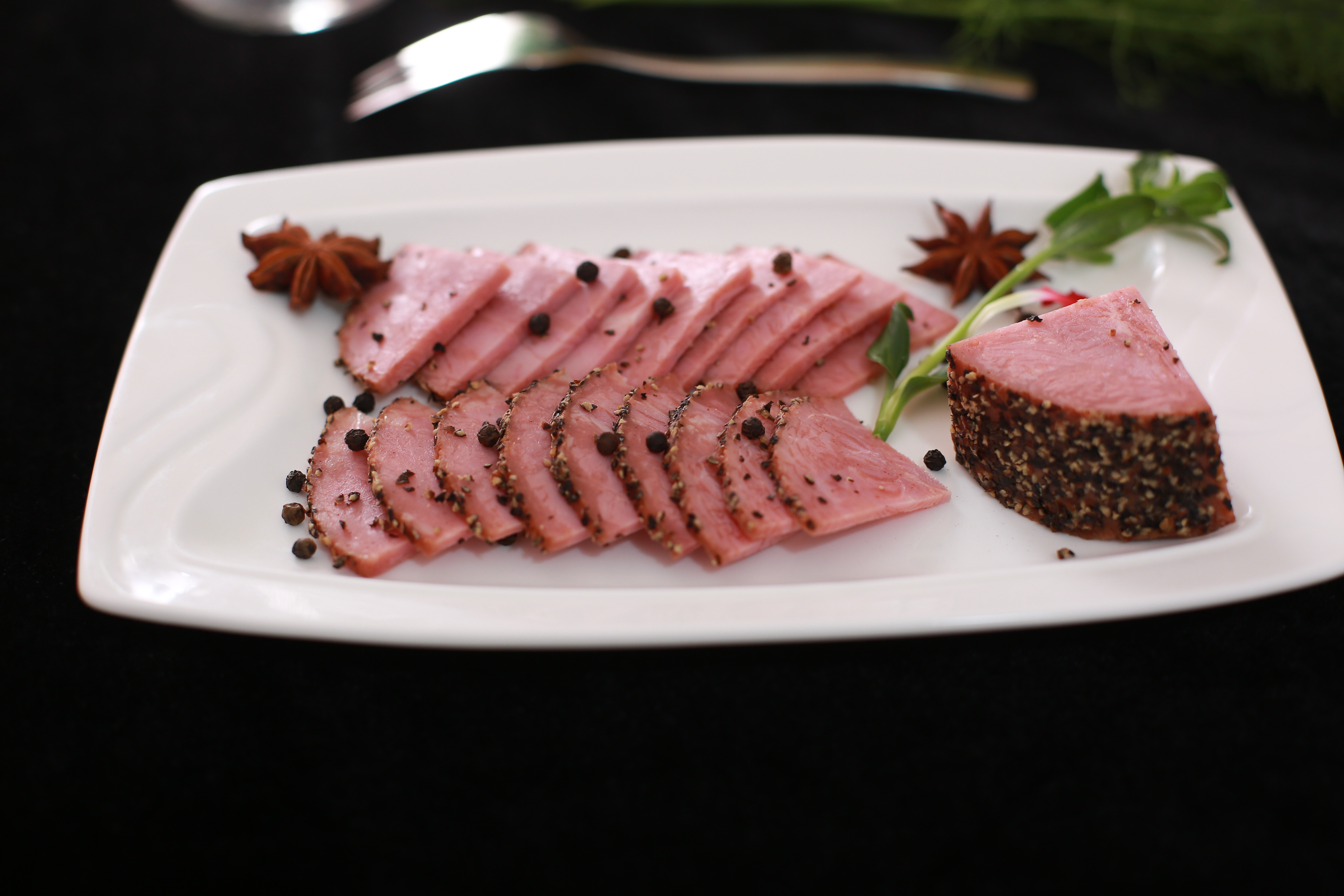 黑胡椒火腿横切面可以看到大块大块的肉块,肉香浓郁,香中带辣,口感非常好。