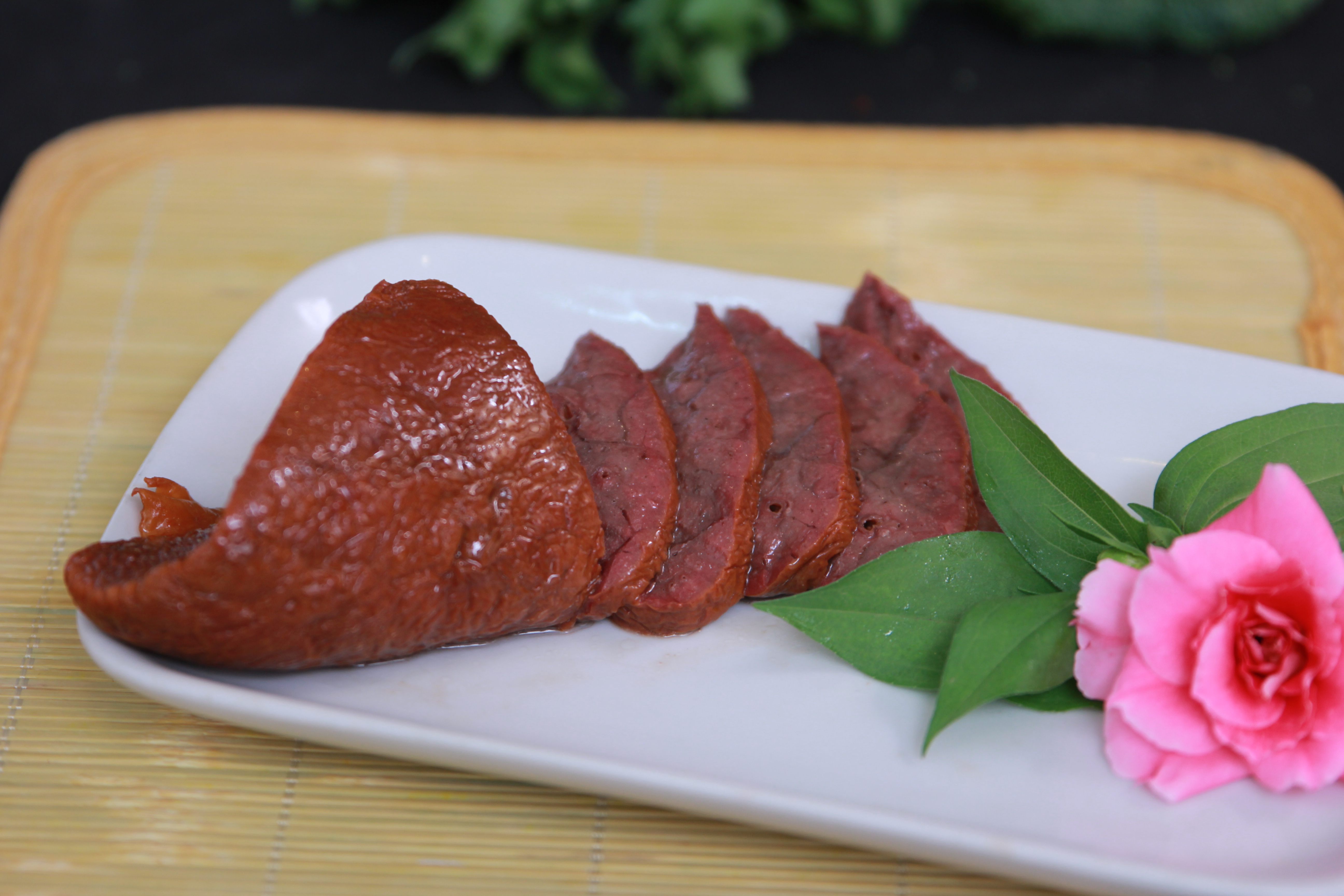 猪肝卤熟后,细致紧实,口感细腻,无香精,老人小孩可放心食用,含铁丰富是补血佳品。
